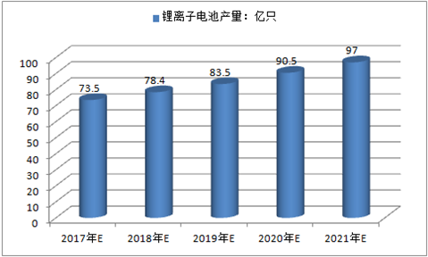 2015年,中國鋰離子電池產(chǎn)量為56.0億只,同比增長3.1%。;2016年1-9月,產(chǎn)量達到52.4億只,同比增長32.8%。預計2017年中國鋰離子電池產(chǎn)量將達到73.5億只,未來五年(2017-2021)年均復合增長率約為7.17%,2021年中國鋰離子電池產(chǎn)量將達到97.0億只。