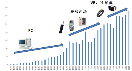 半導(dǎo)體是需求推進(jìn)的市場(chǎng),在過去四十年中,推動(dòng)半導(dǎo)體業(yè)增長(zhǎng)的驅(qū)動(dòng)力已由傳統(tǒng)的PC及相關(guān)聯(lián)產(chǎn)業(yè)轉(zhuǎn)向移動(dòng)產(chǎn)品市場(chǎng),包括智能手機(jī)及平板電腦等,未來則可能向可穿戴設(shè)備、VR/AR設(shè)備轉(zhuǎn)移。