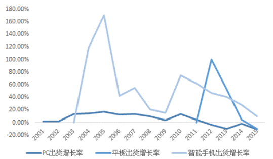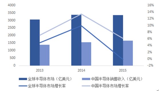 受宏觀經(jīng)濟(jì)因素的影響,全球半導(dǎo)體元器件需求不振。根據(jù)SIA公布的數(shù)據(jù),2015年全球半導(dǎo)體市場(chǎng)銷售額為3352億美元,同比下降了0.2%。全球半導(dǎo)體市場(chǎng)下滑的主要原因是PC銷售下降和智能手機(jī)出貨增速放緩。根據(jù)IDC統(tǒng)計(jì),2015年全球PC和平板出貨量同比下降約10%,而智能手機(jī)的增速?gòu)?014年27%降至10.13%。