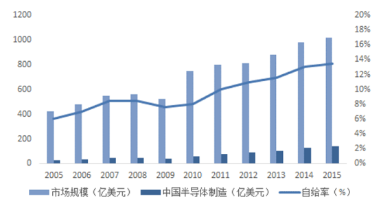 從市場(chǎng)規(guī)模和自制能力的角度來看,中國(guó)作為全球半導(dǎo)體核心市場(chǎng),對(duì)半導(dǎo)體存在巨大需求,可是根據(jù)ICinsights的數(shù)據(jù),2015年國(guó)內(nèi)的半導(dǎo)體自給率僅為13.5%左右。